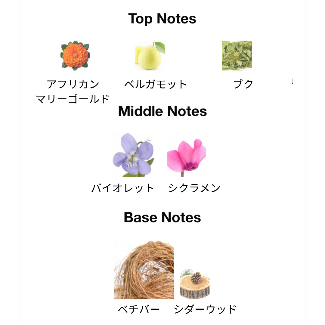 アフリカの情熱とヨーロッパの洗練を融合した、ウッディ・フローラル・ムスクの香り。トップはベルガモット、レモン、ネロリの爽やかさから始まり、すぐにアフリカンマリーゴールドとジャスミンの柔らかいフローラルが重なります。ベースのベチバー、アンバー、ムスク、シダーウッドが深みと温かさを添え、全体を滑らかにまとめ上げています。