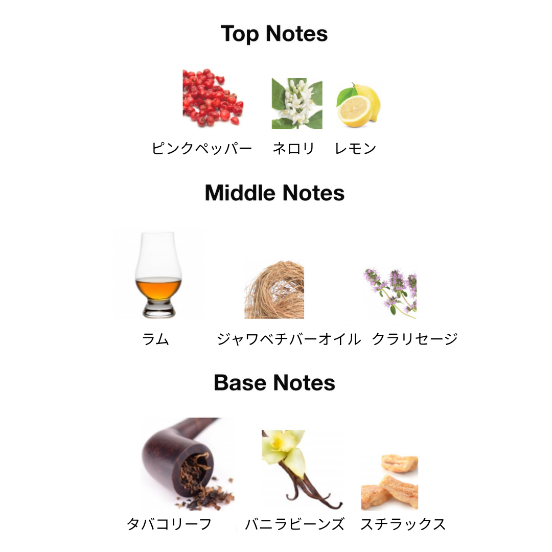 甘くスモーキーなラム酒タバコ、そしてバニラが織りなす、温かく心地よい香り。オープニングはラムの甘く芳醇な香りが広がり、次第にタバコの深みとバニラのまろやかさが現れます。微かに感じるレザーベンゾインが、落ち着いた大人の余韻を演出します。
