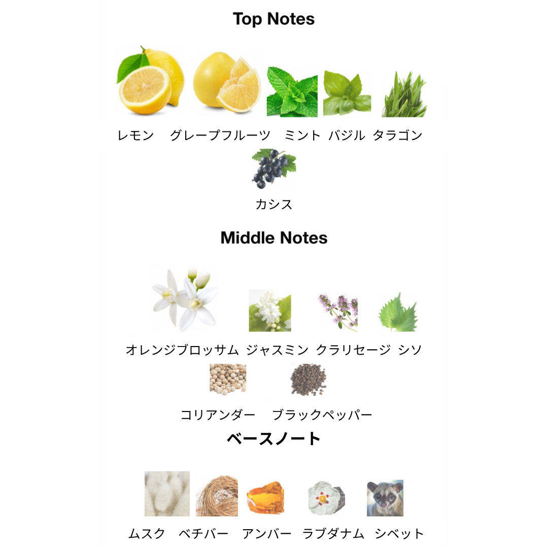 南イタリア・アマルフィ海岸の空気をイメージした、爽やかで透明感のあるシトラスアロマの香り。トップではマンダリンオレンジ、グレープフルーツ、レモンのジューシーな香りが弾け、すぐにバジル、ミント、シソのようなハーバルな清涼感が広がります。ベースにはムスクとアンバーがほんのりと残り、心地よい余韻を与えます。